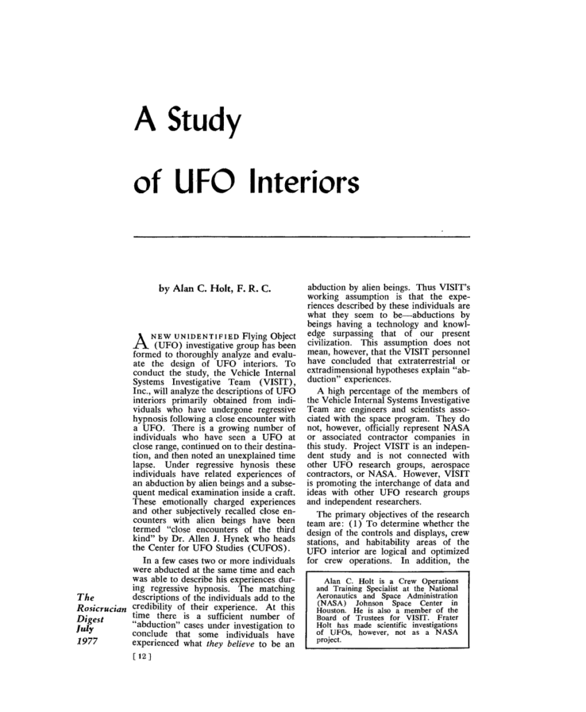 The most consequential intersection, however, appears in a July 1977 issue: an article titled “A Study of UFO Interiors” by Alan C. Holt, F.R.C., identified in the magazine as a Crew Operations and Training Specialist at NASA’s Johnson Space Center, and a board trustee for an independent investigative effort called VISIT (Vehicle Internal Systems Investigative Team). The article explicitly notes that his UFO investigations were not a NASA project and that VISIT did not represent NASA or contractor companies.