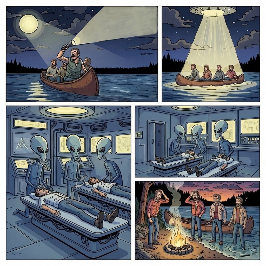 Whatever the true dimensions of the firewood, all four initially agreed that something about the elapsed time felt wrong. They were tired, confused, and went to sleep without discussing it deeply. The next day they continued their canoe route.