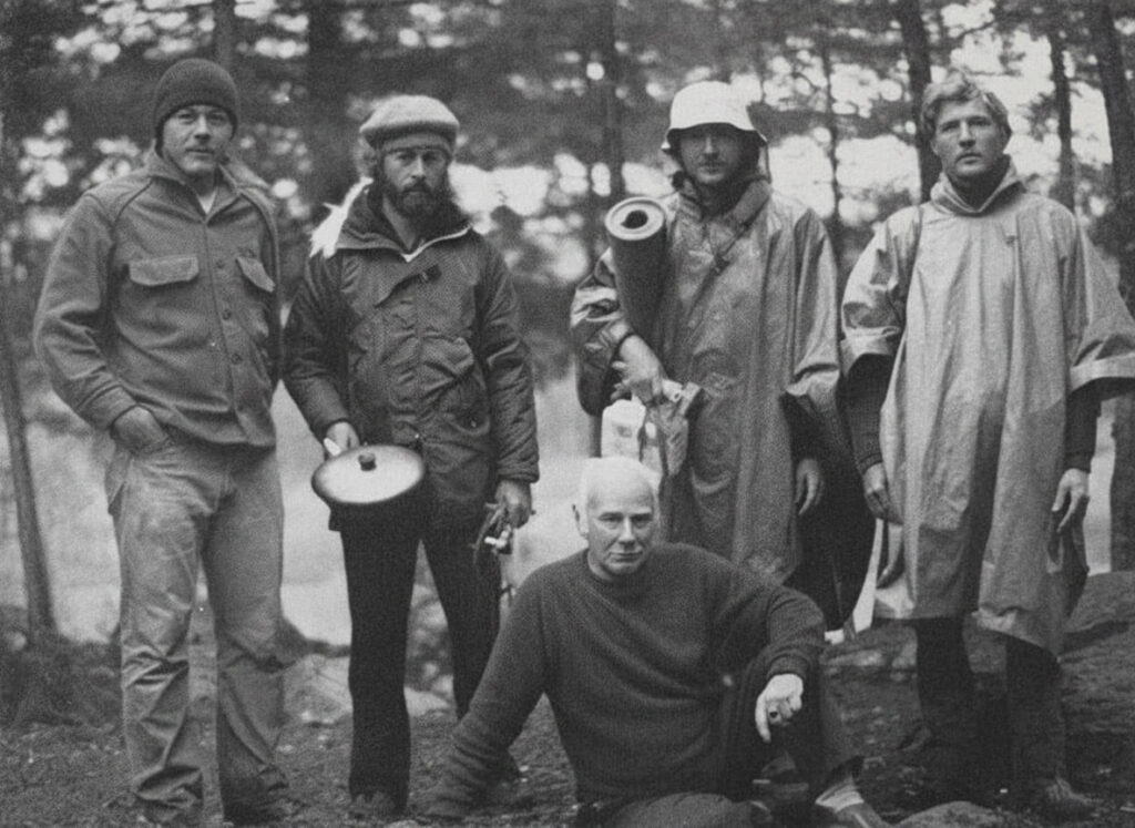 The Allagash four with someone sitting. From left to right in back: Charlie Foltz, Chuck Rak, and the Weiner twins. Seated man came out of the woods, stayed for awhile, left, and never gave his name.