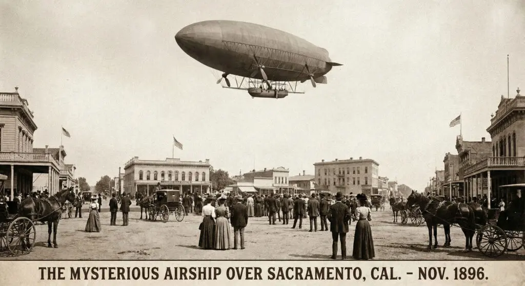 California ignitionNov–Dec 1896Bay Area & Central Valleybright moving light; “airship” rumors; occasional structureHundreds of witnesses reported an “airship” in the Bay Area press environment.