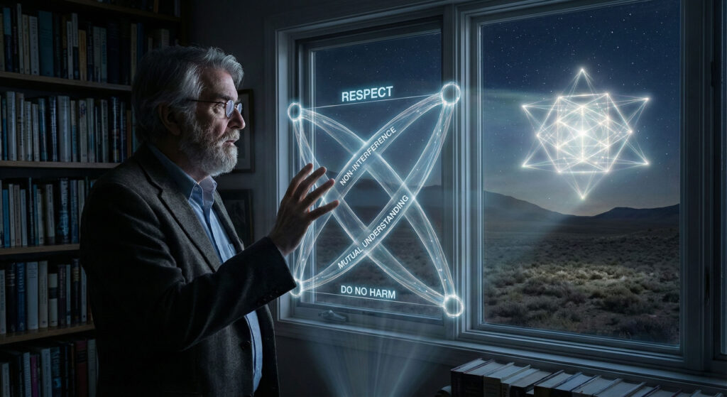 Even if one does not accept metaphysical claims, an ethical takeaway remains: approach contact with humility, respect for free will, and a planetary commons mindset. (Affs)