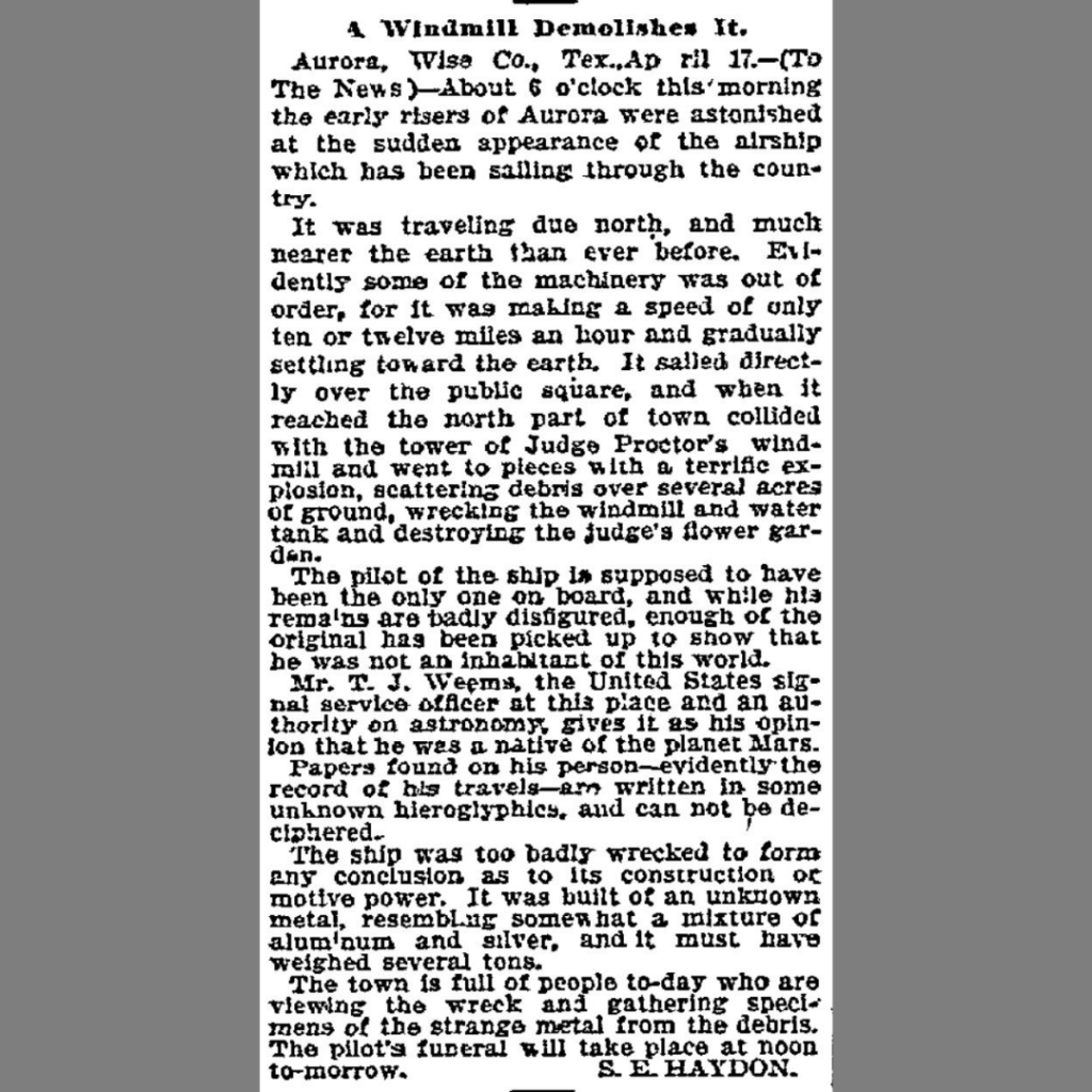 The Aurora, Texas (1897) story is widely treated as fabricated in historical commentary, even though it remains influential in UAP lore. (Texas State Historical Association)