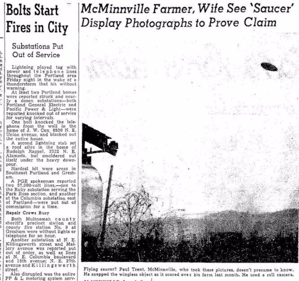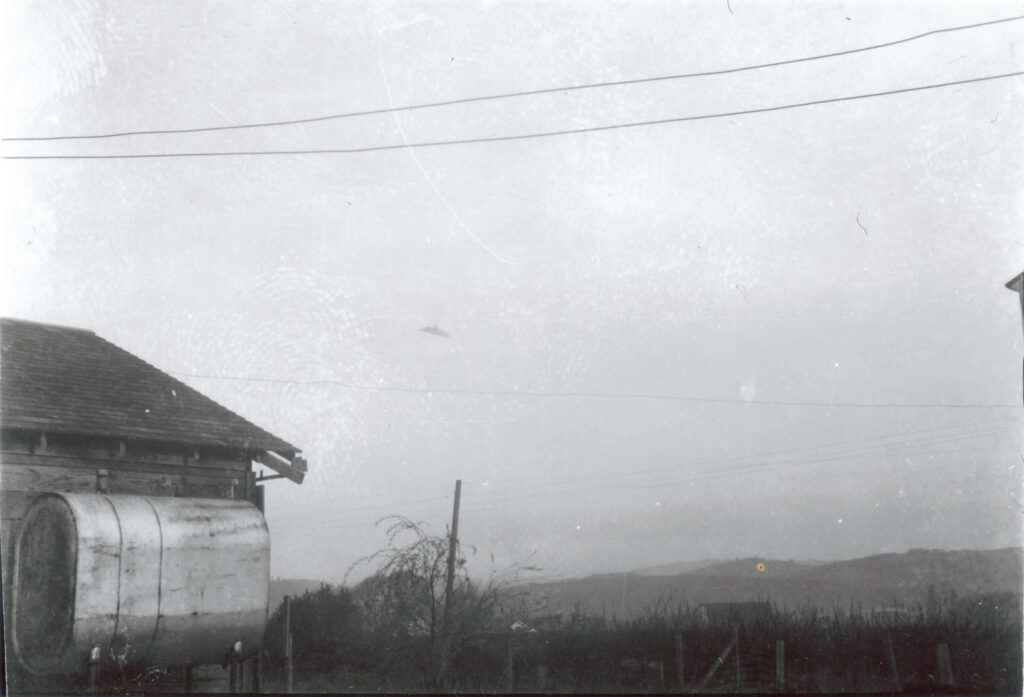 Fast-forward a century and change and you get a very different kind of memory, one that arrives from above. On 11 May 1950, a farm about 10 miles southwest of McMinnville became the setting for two photographs that still anchor arguments on both sides of the “prosaic vs. non-prosaic” divide. (NCAS Files)
