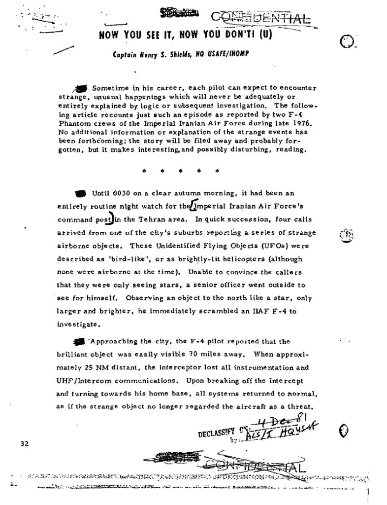 In the early hours of September 19, 1976, Tehran’s night sky became the stage for one of the best-documented Cold War UAP encounters. Phone calls from residents in Shemiran triggered an alert cascade: Mehrabad International Airport’s night-shift team observed a luminous object; the Imperial Iranian Air Force (IIAF) scrambled two F-4 Phantom II interceptors; aircrews reported radar acquisition at ~27 nm, communications loss, and, in the second intercept, an attempted AIM-9 launch aborted when the weapons control panel died. The event generated a rapid Defense Intelligence Agency (DIA)/Joint Chiefs of Staff cable and within the U.S. signals community, an Air Force MIJI (Meaconing, Intrusion, Jamming & Interference) editorial noting persistent anomalies reported by the aircrews. Decades later, the official documents remain the backbone of the case file. U.S. Department of War