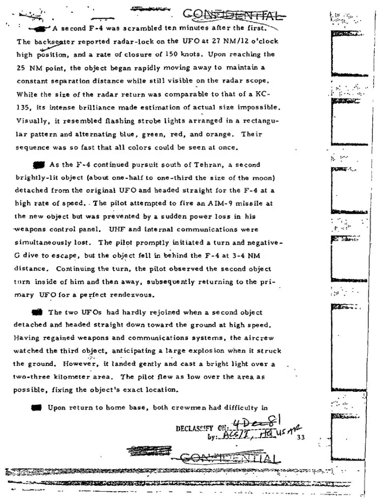 NICAP dossier (text + scans) Tehran, Iran / F-4 Incident: transcription of the DIA report, ancillary notes on the airliner comms failure and the cylinder-shaped object. nicap.org