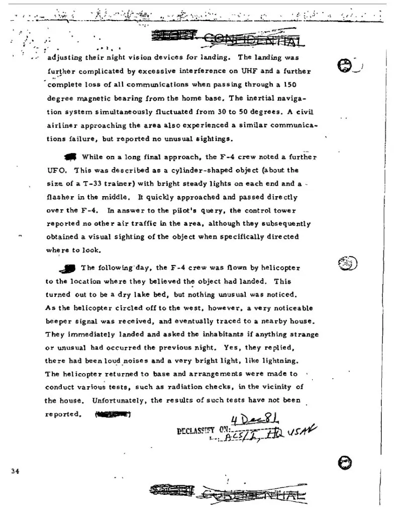 - Multi-sensor & multi-aircraft: Two separate F-4s reported EMI/comm loss correlated with proximity; F-4 #2 obtained radar lock, and Mehrabad (once prompted by the jet) reported visual on an object in a no-traffic sector. A civilian airliner also logged a comms anomaly near Kilo Zulu the same night. U.S. Department of War