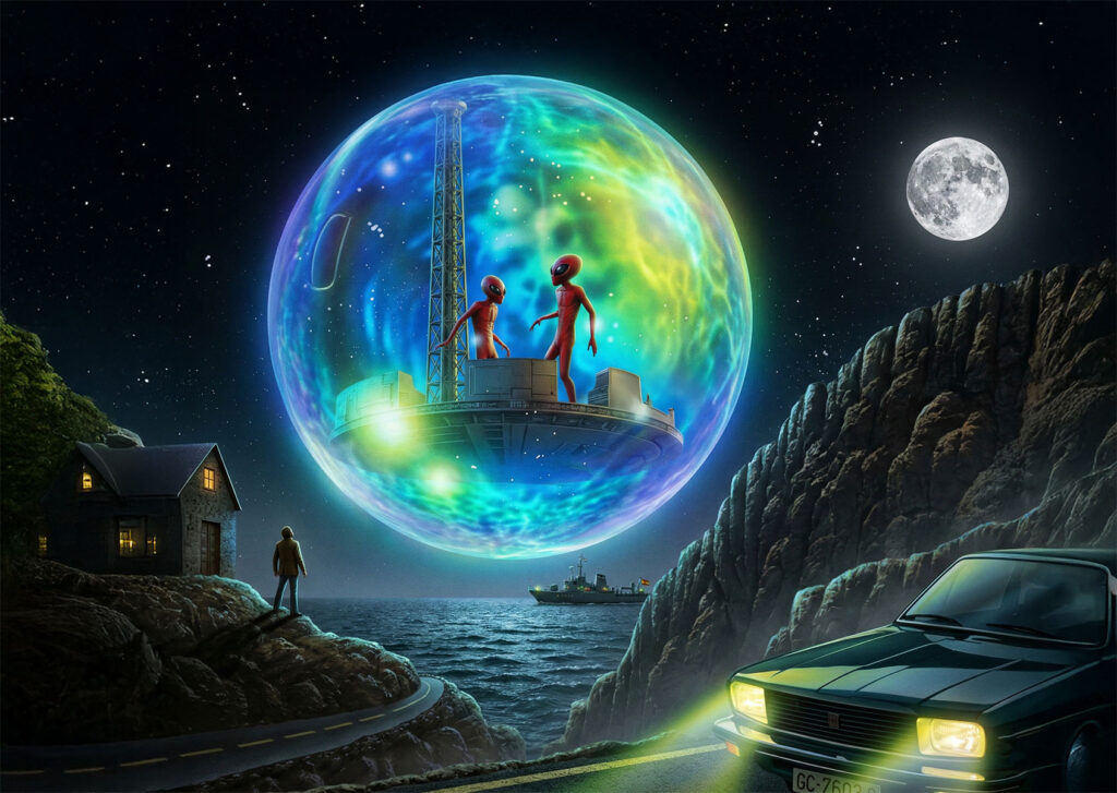 What’s the claim? In Gáldar (Gran Canaria), a physician traveling by taxi reported approaching a transparent sphere parked near ground level containing two tall, red-clad figures at consoles. It is the only such account among a broad witness base reporting a distant expanding light. Academia