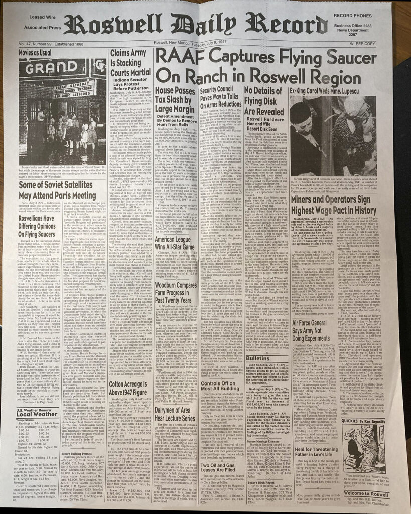 Roswell Daily Record. (1947, July 8). RAAF Captures Flying Saucer On Ranch in Roswell Region. (Wikimedia)