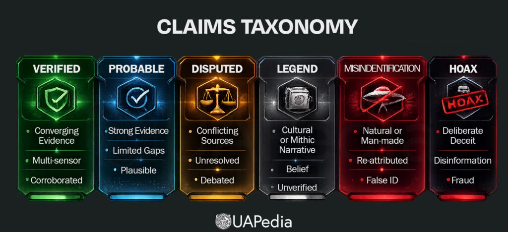 To prevent epistemic drift, UAPedia requires explicit separation between evidence and interpretation using the following labels: