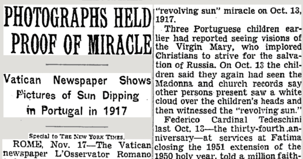 The most famous contemporary account belongs to journalist Avelino de Almeida, sent by O Século. NewsMuseum calls him one of the most accredited journalists of his time. Its excerpt from his report describes an immense crowd turning toward a cloud-cleared sky, a dull silver-like solar disk visible without the usual pain, and then a collective cry as the object appeared to move in abnormal ways. Whether one reads that as a literal celestial event or as a field report of crowd perception under unusual conditions, it is a major contemporary source. It is one of the reasons Fatima cannot be reduced to “later believers said.” A reporter was there, and he wrote. (NewsMuseum)