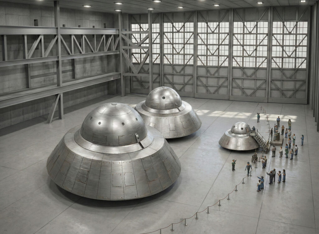 In that hangar, the general gave a walkthrough of advanced classified aircraft. Eventually, a curtain was pulled back to reveal three disc-shaped craft that looked, as Sorensen allegedly put it, “like something from the 1950s.” (PodScripts)
