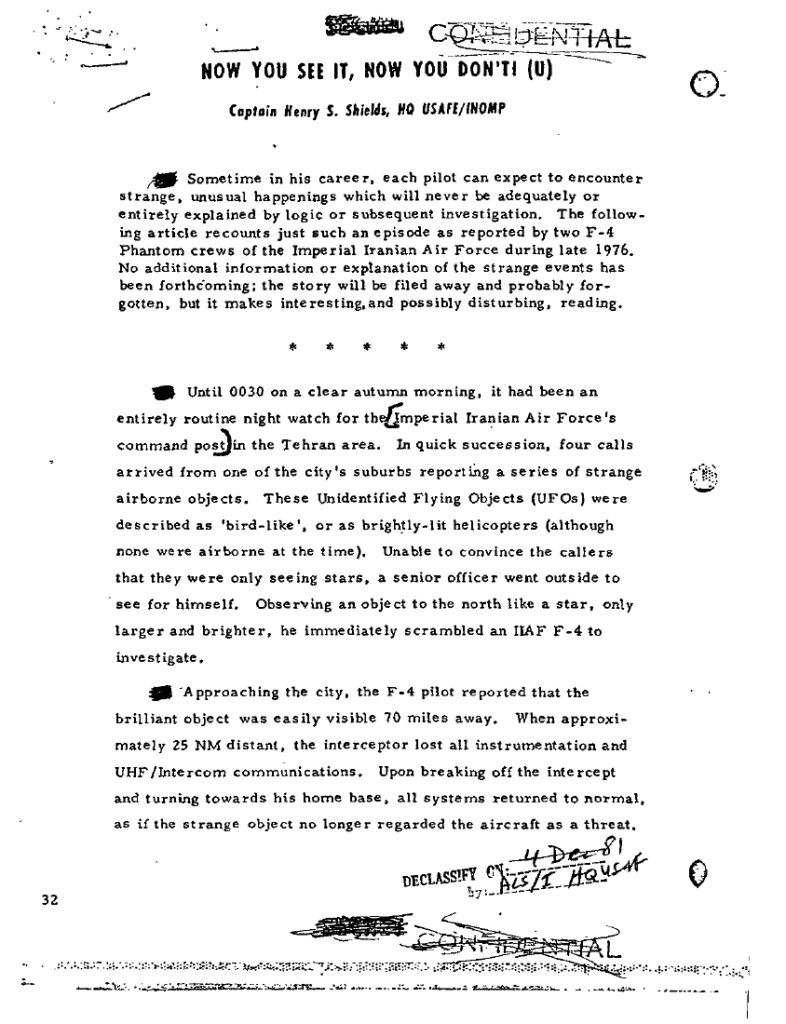 In the early hours of September 19, 1976, Tehran’s night sky became the stage for one of the best-documented Cold War UAP encounters. Phone calls from residents in Shemiran triggered an alert cascade: Mehrabad International Airport’s night-shift team observed a luminous object; the Imperial Iranian Air Force (IIAF) scrambled two F-4 Phantom II interceptors; aircrews reported radar acquisition at ~27 nm, communications loss, and, in the second intercept, an attempted AIM-9 launch aborted when the weapons control panel died. The event generated a rapid Defense Intelligence Agency (DIA)/Joint Chiefs of Staff cable and within the U.S. signals community, an Air Force MIJI (Meaconing, Intrusion, Jamming & Interference) editorial noting persistent anomalies reported by the aircrews. Decades later, the official documents remain the backbone of the case file. U.S. Department of War