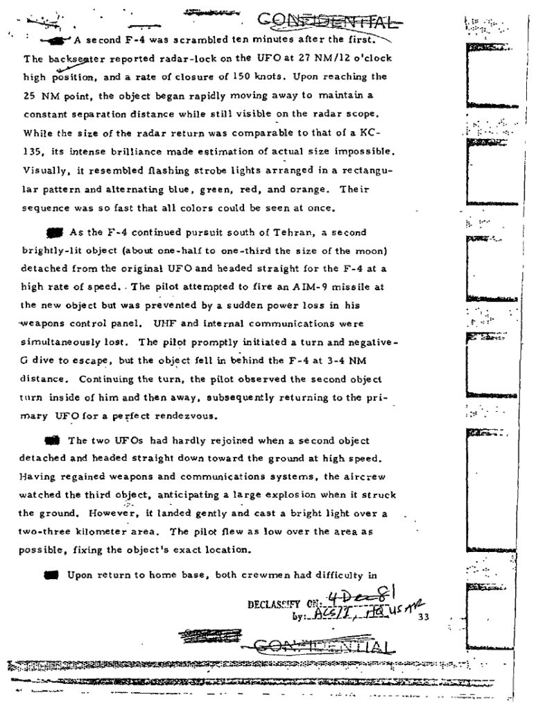 NICAP dossier (text + scans) Tehran, Iran / F-4 Incident: transcription of the DIA report, ancillary notes on the airliner comms failure and the cylinder-shaped object. nicap.org