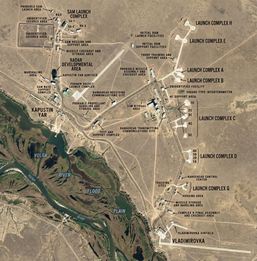 Known. Kapustin Yar is a genuine strategic test range with a documented Cold War role in Soviet missile and space programs. It sits near the Volga steppe within operational reach of Volgograd and Astrakhan. Western open sources and declassified imagery have detailed its complexes since the 1960s. The range is still active today.